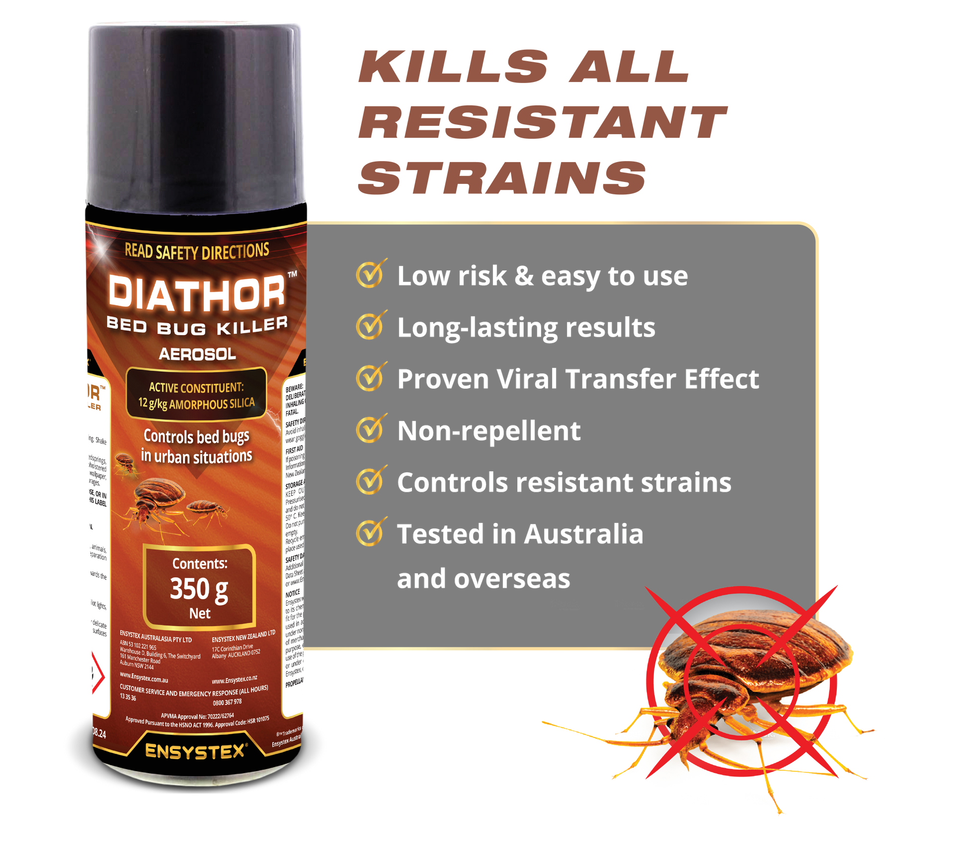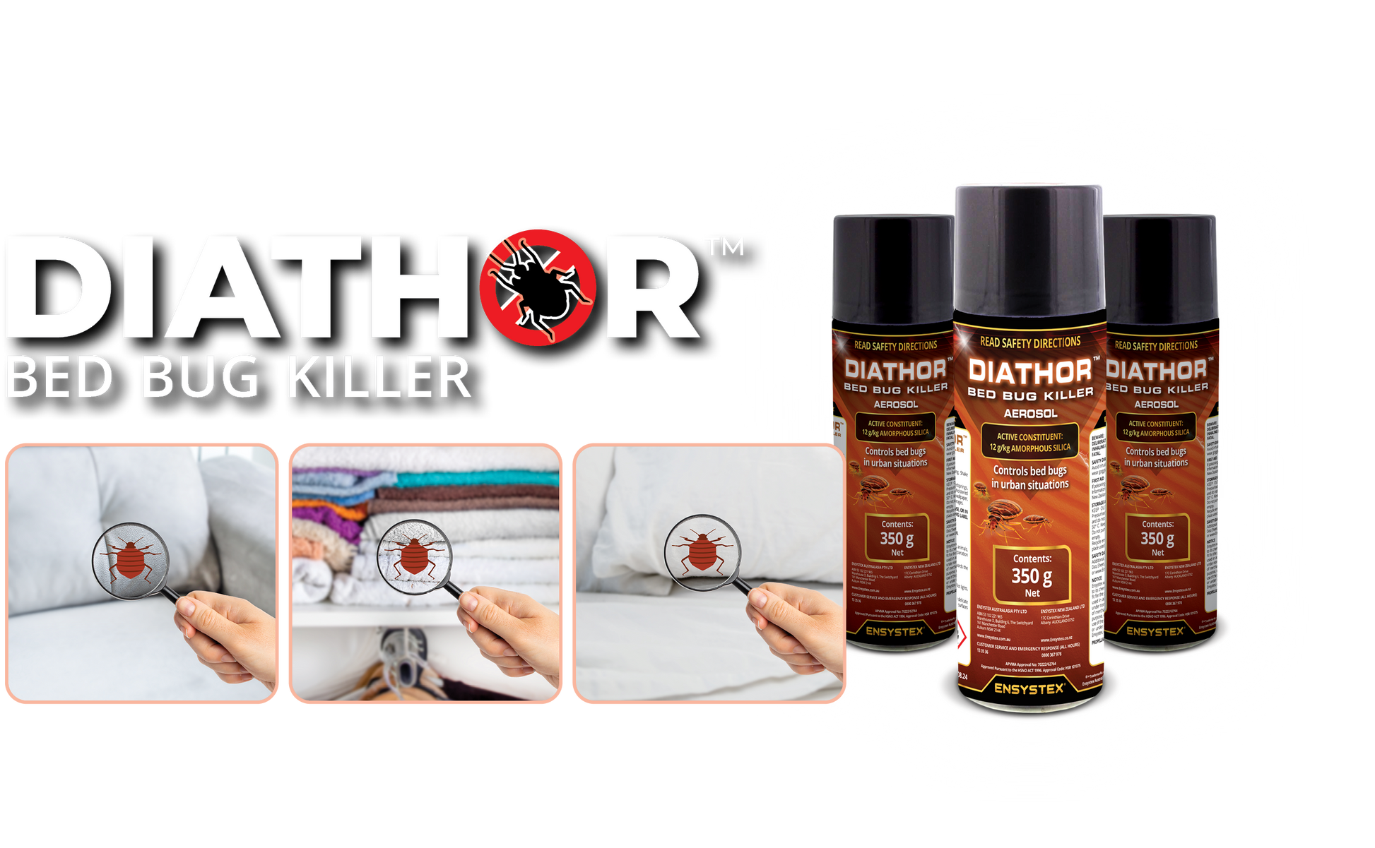 Dr Stephen Doggett of Department of Medical Entomology, NSW Department of Health reported “The results demonstrate several benefits of DIATHOR. The faster kill means that the client is less likely to suffer bed bug bites and the ensuing adverse health effects. A faster kill means that bed bugs are less likely to spread and infest other areas or adjoining premises/rooms in apartments or hotels.”