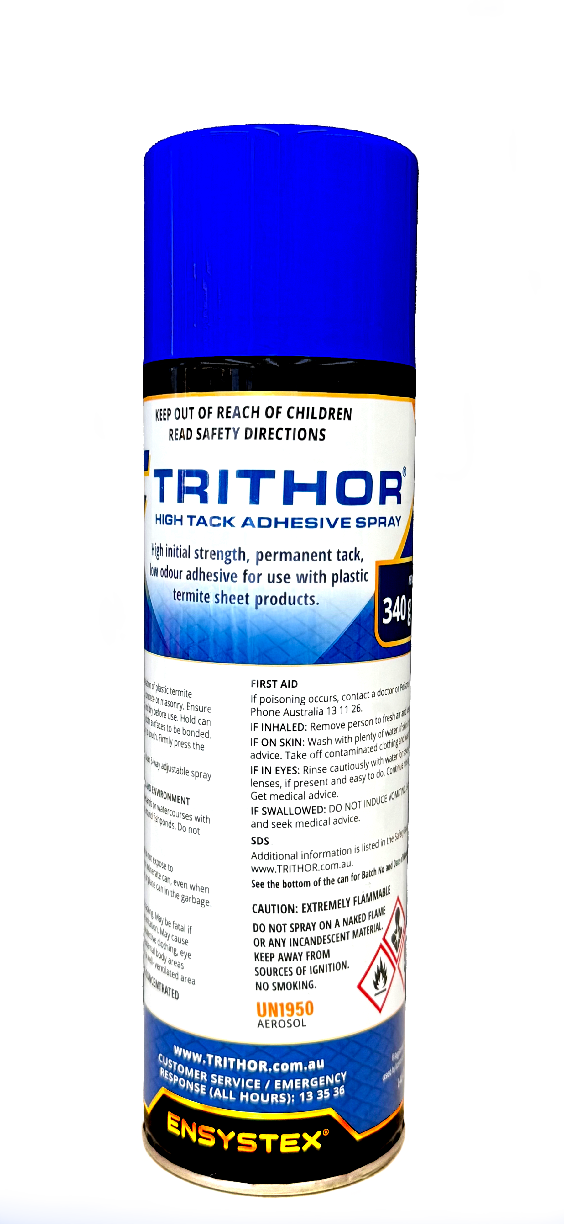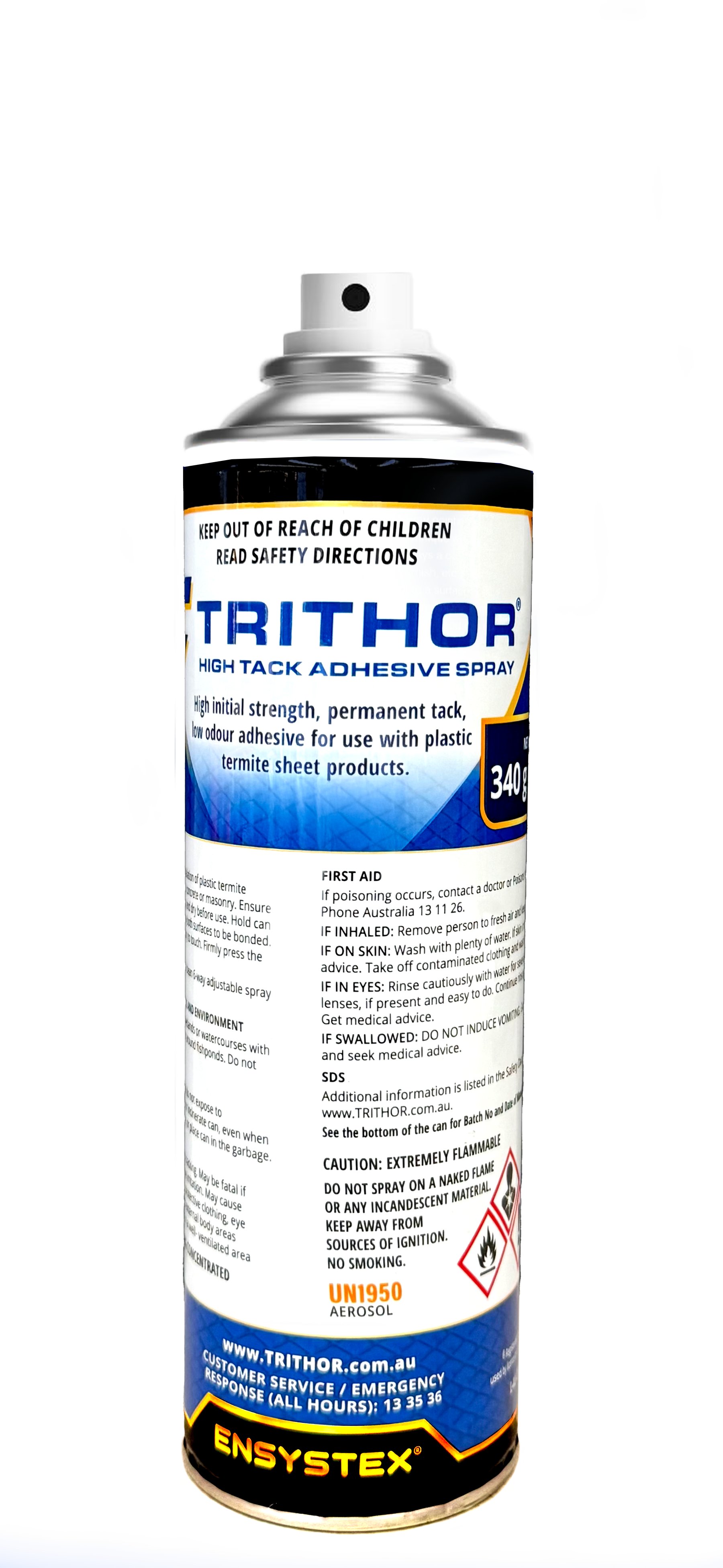 TRITHOR High Tack is a high initial strength, permanent tack, low odour adhesive designed for use with plastic termite sheet products to ensure high bond strength. Fully tested and proven in Australia, TRITHOR High Tack provides superior adhesion and coverage. TRITHOR High Tack adhesive is considered termite-resistant in accord with the requirement of AS 3660.1 for use with chemically treated termite sheets, that are not fully and permanently compressed between other building components. TRITHOR High Tack is supplied in a 500 mL aerosol can and will cover up to 7 m2 of surface.